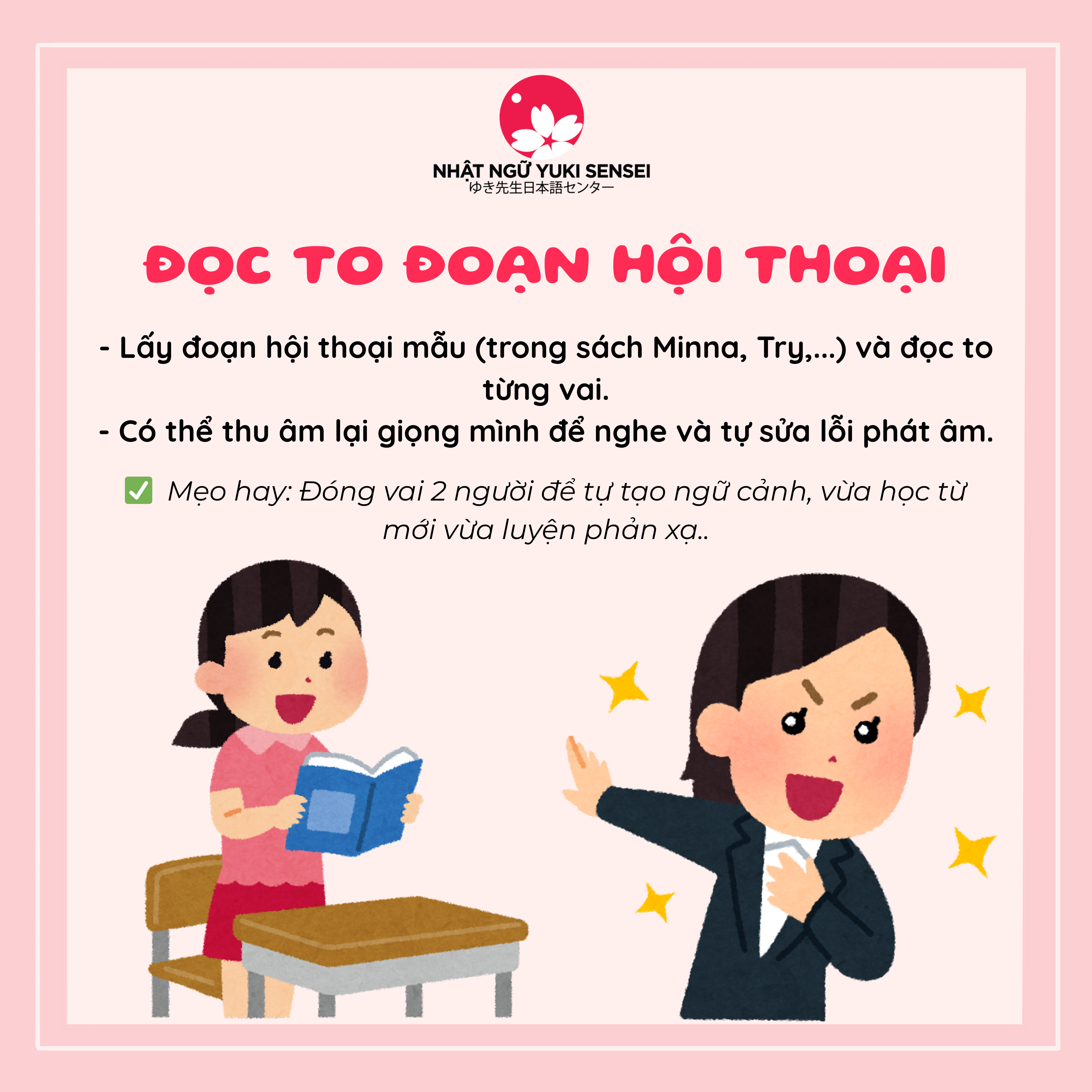 Đọc to từng vai, có thể thu âm lại để tự nghe và sửa lỗi phát âm.
