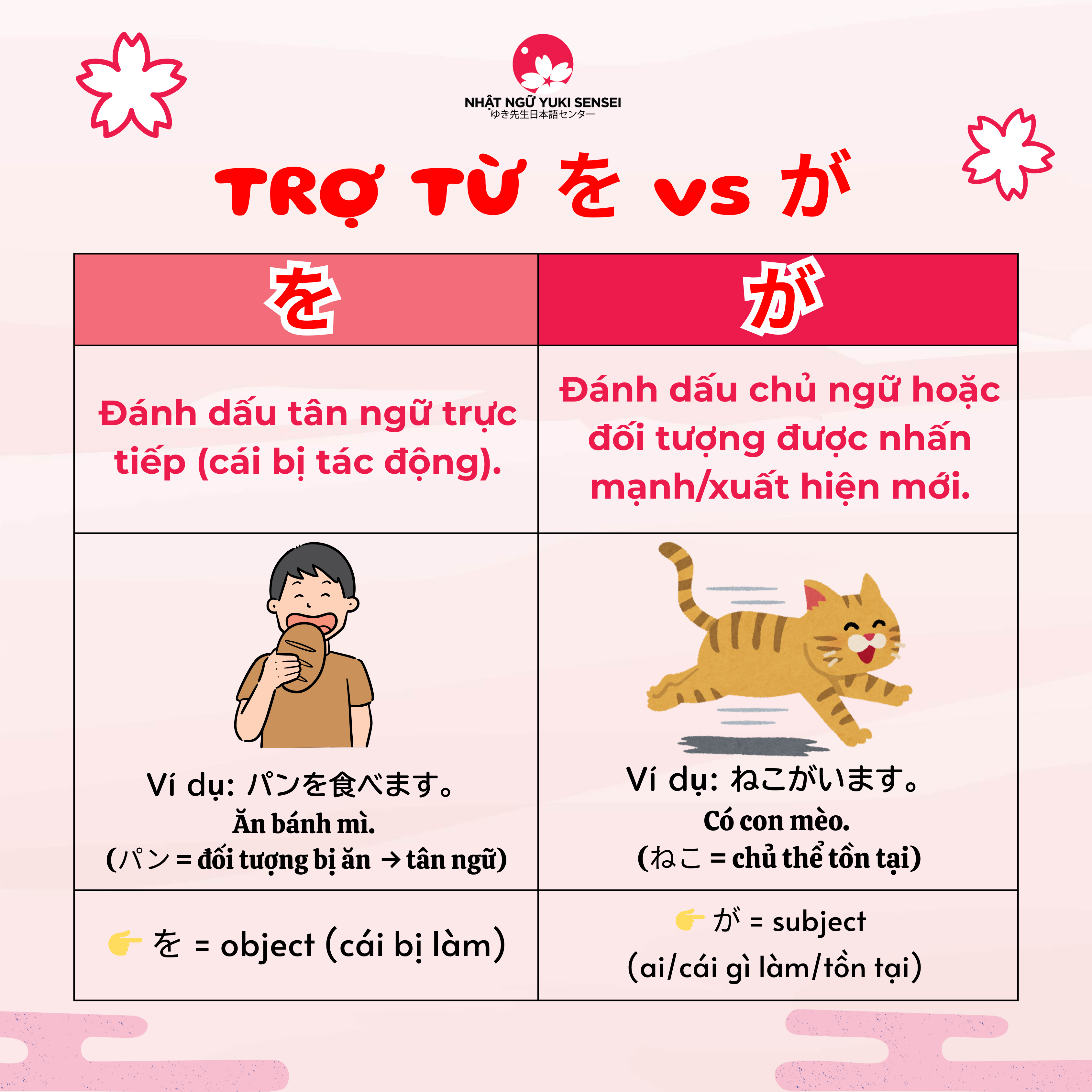 が | Đánh dấu chủ ngữ hoặc đối tượng được nhấn mạnh / xuất hiện mới | ねこがいます。(Có con mèo) | “ねこ” là chủ thể tồn tại |