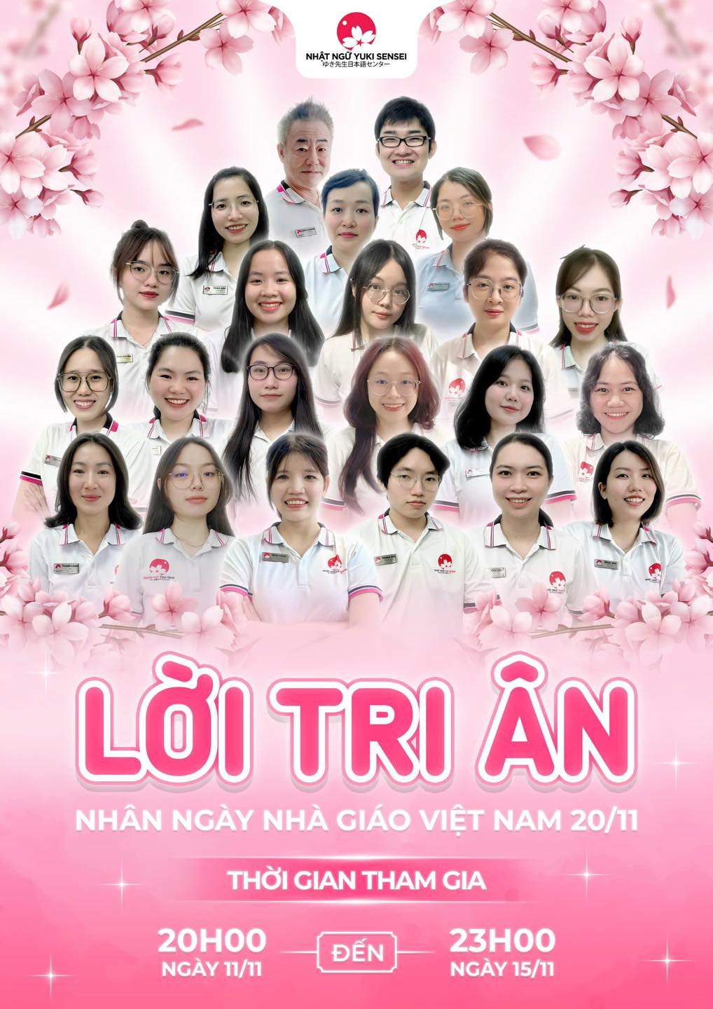 Với mong muốn lan tỏa sự biết ơn và gắn kết yêu thương, Nhật Ngữ Yuki Sensei xin mời các bạn tham gia chương trình "Lời Tri Ân". Đây là dịp để các bạn gửi gắm những lời cảm ơn, những lời chúc chân thành nhất đến những người thầy, người cô kính yêu.